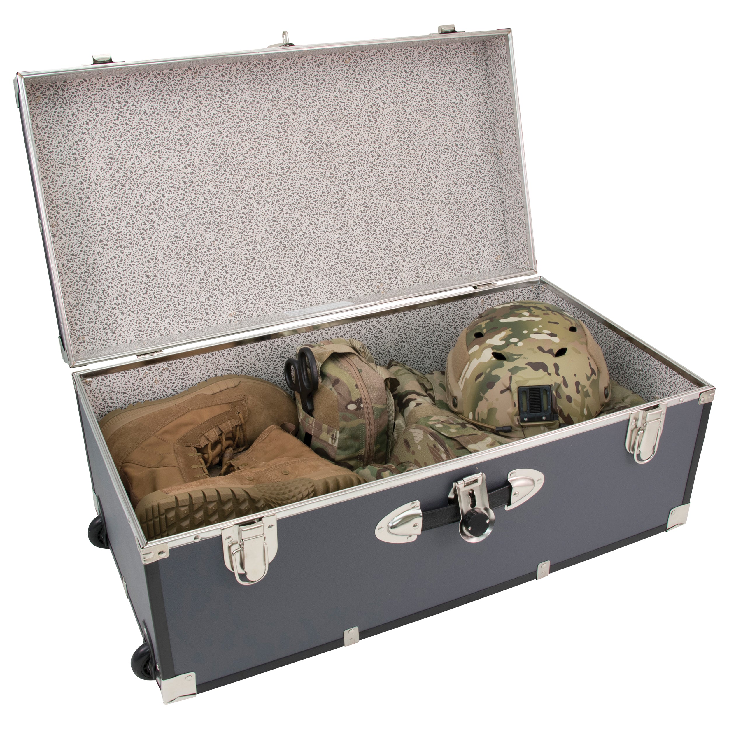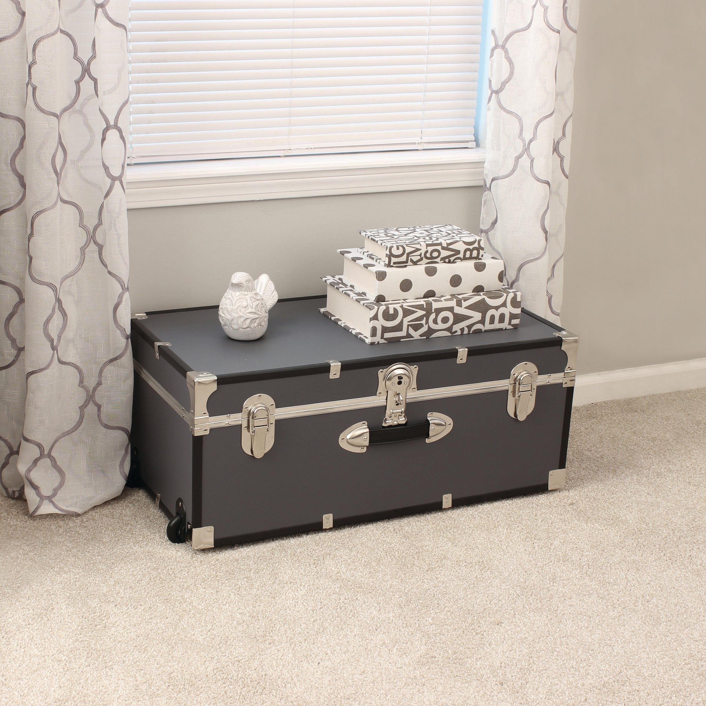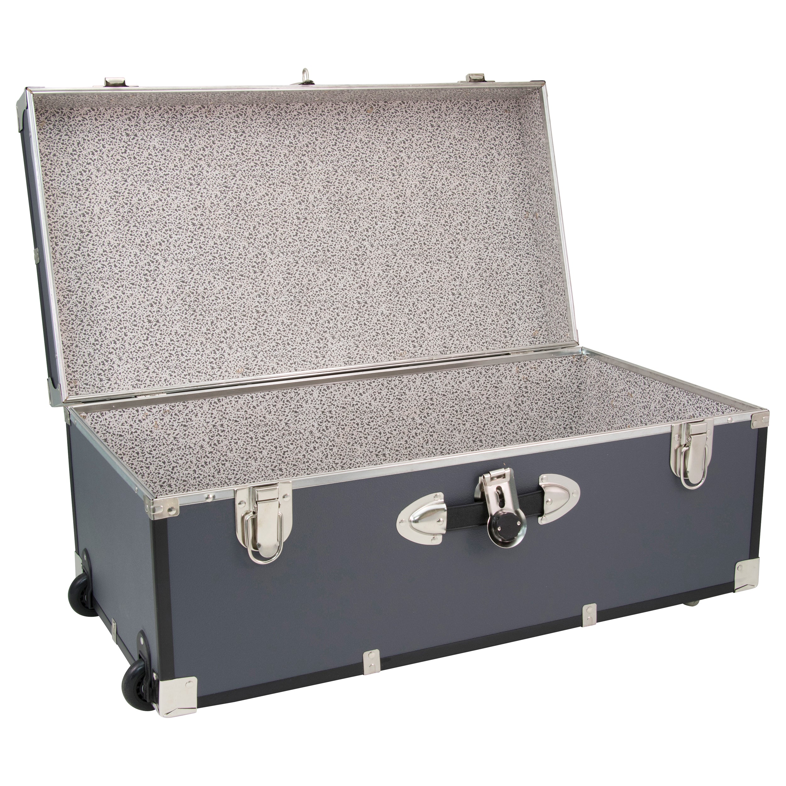 The Seward Explorer 30" Trunk is the perfect storage solution for any room in your home and on the go. This wheeled trunk is a camper's ideal packing solution as well as a dorm dweller's mobile furniture piece with ample storage. It features classic nickel hardware with black binding and nickel corner guards. The dual lock-down latches helps keep dust and moisture out. The push-button center latch has an optional locking feature (includes keys). For additional security, add a padlock. The trunk also has two handles, one on the front and one on the side for easy moving and control.